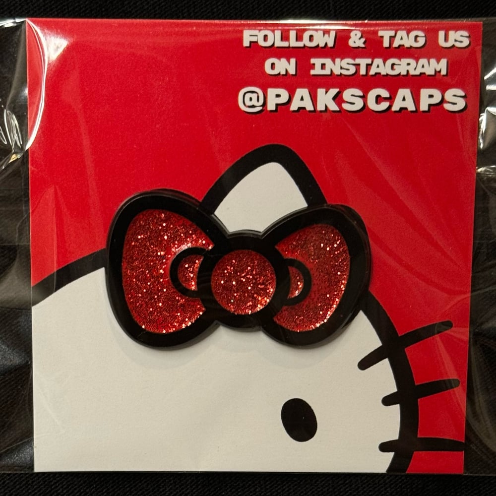 The iconic Hello Kitty Bow in pins or blips! Both measures 1.5in long. 1st edition is the traditional black outline with red glitter. These are ready to ship!